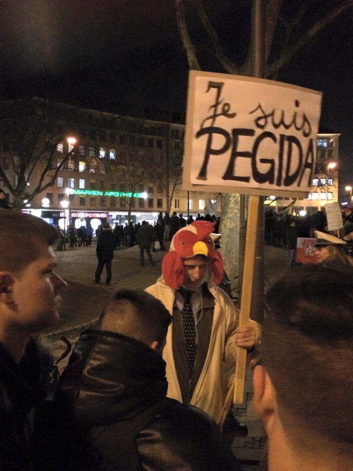 Ein als Hahn kostümierter Mann, der einen Kinderwagen schob und ein Schild mit der Aufschrift „Je suis Pegida!“ vor sich her trug, löste sich von der Menge und trat zu den staunenden bunten Menschen jenseits des Gatters. Also zu uns. Um zu diskutieren. Die Diskussion verlief wie folgt.