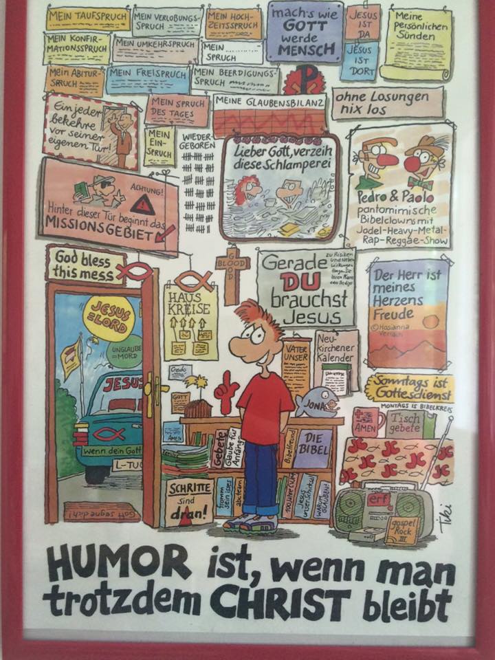 Was ich daran mag: Es enthält ein schönes Stück christliche Selbstironie. Der Mensch da hat sein Zimmer geradezu tapeziert mit allerlei christlich angehauchtem Schnickschnack. Vermutlich muss er sich selber immer wieder daran erinnern, woran er glaubt. Bevor er das kuschelige Zuhause verlässt und das Missionsgebiet der bösen Welt da draußen betritt.