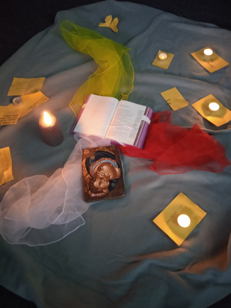 Benötigt: Bibel, Tuch/Tücher, 1 große Kerze, Bild Krippe, bzw. Marienikone, bzw. Krippe und Jesuskind, Stifte, Karten, Teelichter, evtl. Klangschale als Anfangs- und Endsignal.