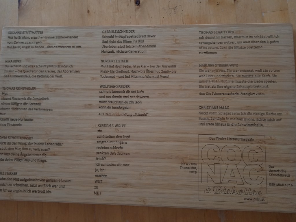 Vor ein paar Wochen wurde ich fündig. Ein „Literaturmagazin“ namens „Cognac und Biskotten“ aus Tirol sucht Kurztexte zum Thema Mut. Ich hatte noch nie von denen gehört oder gelesen, fand das Thema aber reizvoll und schrieb einen kurzen persönlichen Text. Vorgabe nicht mehr als 150 Zeichen. Die Ausgabe mit den Mut-Texten sollte „Literarisches Schneidbrettl“ heißen, passender Name, fand ich. Schneid, wie Mut.
