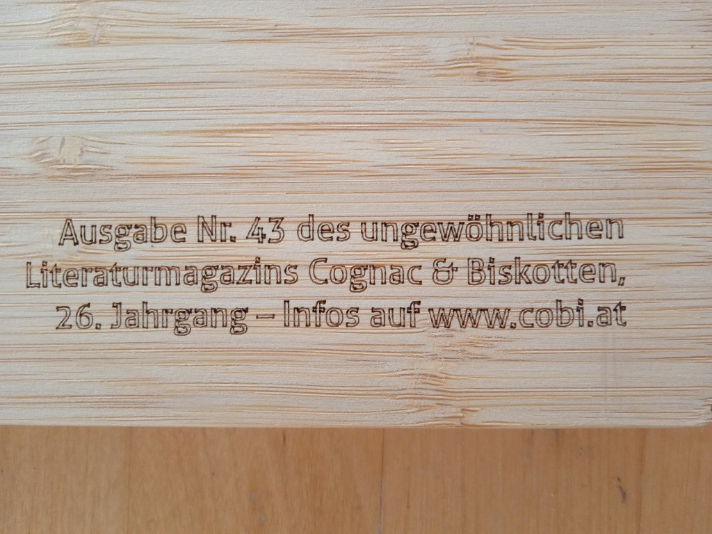 Nach und nach verstand ich. Cognac und Biskotten – das ist kein Literaturmagazin wie andere. Die Texte stehen nicht in Heften sondern auf Alltagsgegenständen (Schneidebrett, Konservendosen, Plastiktüten, etc.) Jede „Ausgabe“ ist ein anderer Gegenstand, Literatur findet so den Weg in den Alltag der Leserinnen und Leser, findet zufällig Lesende, wie die bedruckte Straßenbahn, findet ungewohnte Orte und niederschwellige Settings.