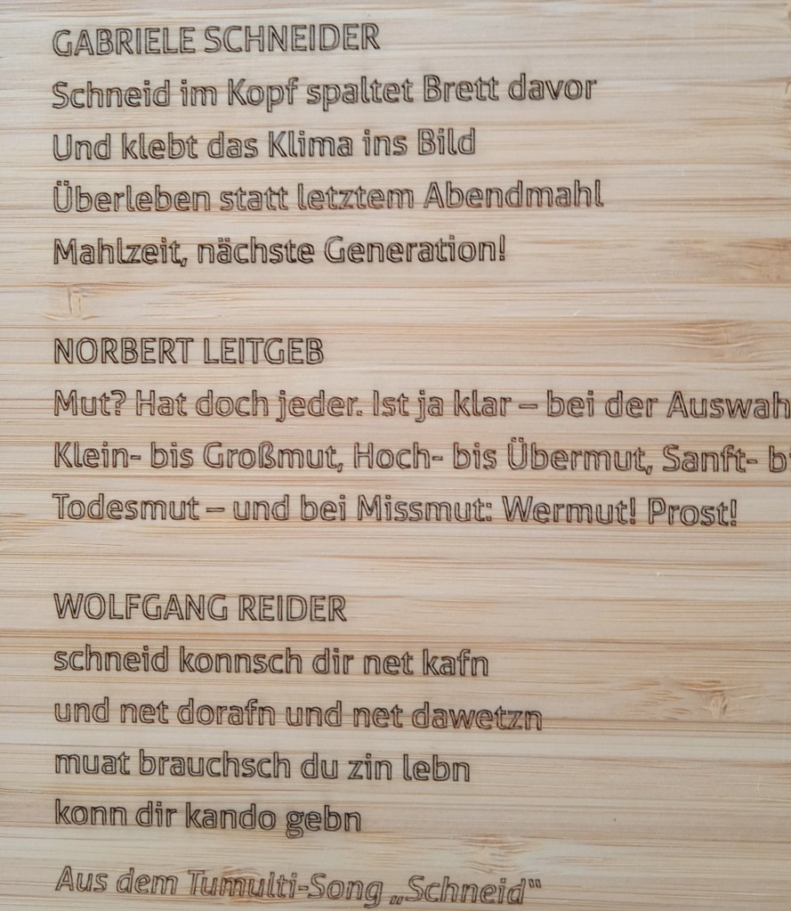 Heute kam mit der Post dann ein ziemlich großes und ziemlich schweres Paket. Verwirrt packte ich es aus – und fand darin: Ein großes Küchenbrett. Aus Holz. Schön verarbeitet. Und säuberlich hineingelasert auf Vorder- und Rückseite 25 Kurztexte über den Mut, manche nachdenklich, andere heiter, alle mutig. Das Brett als solches wertig verarbeitet, es hat einfach Stil.